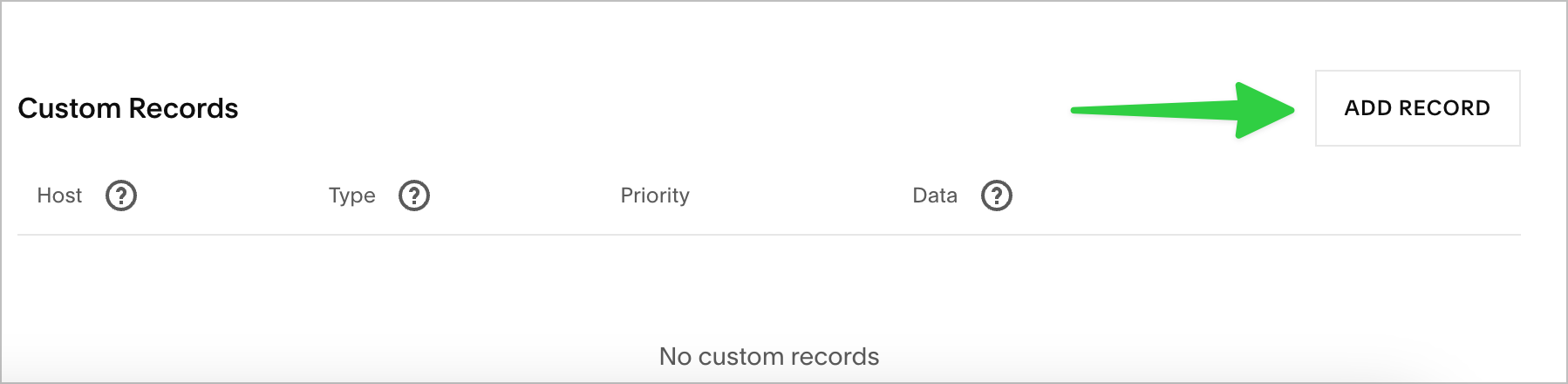 Once that's done, you can click on the Add Record button in the Custom Records area, to create a new DNS record.