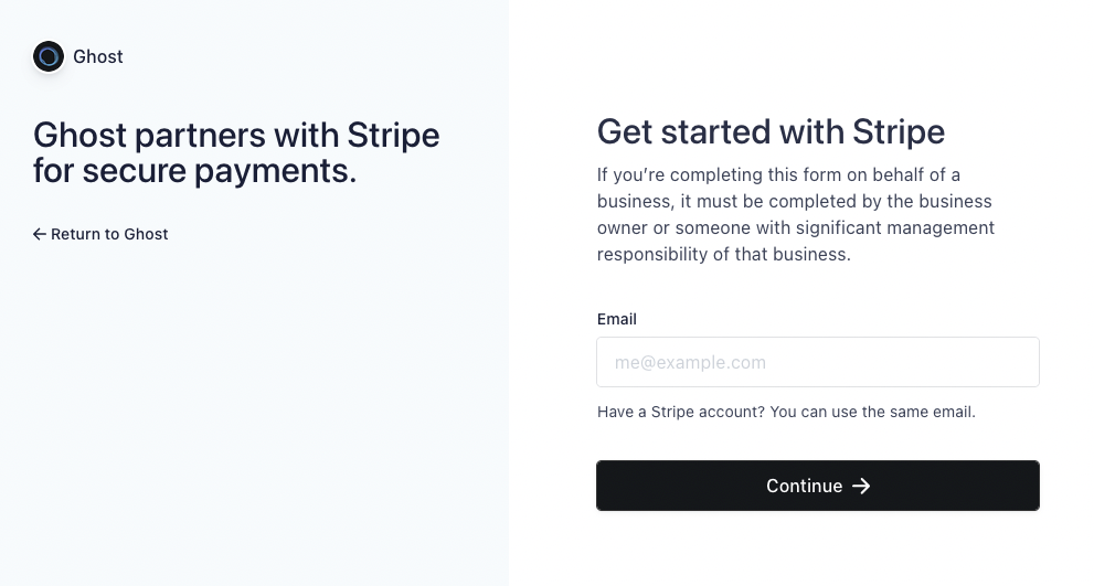 Stripe is our exclusive payments partner. If you don't already have a Stripe account you can create one here. If you have an existing Stripe account for a different type of business, we recommended logging in to Stripe and creating a new account from the Stripe dashboard to use for your Ghost integration. If you are migrating from other platforms such as Substack, you'll need to use the same Stripe account.