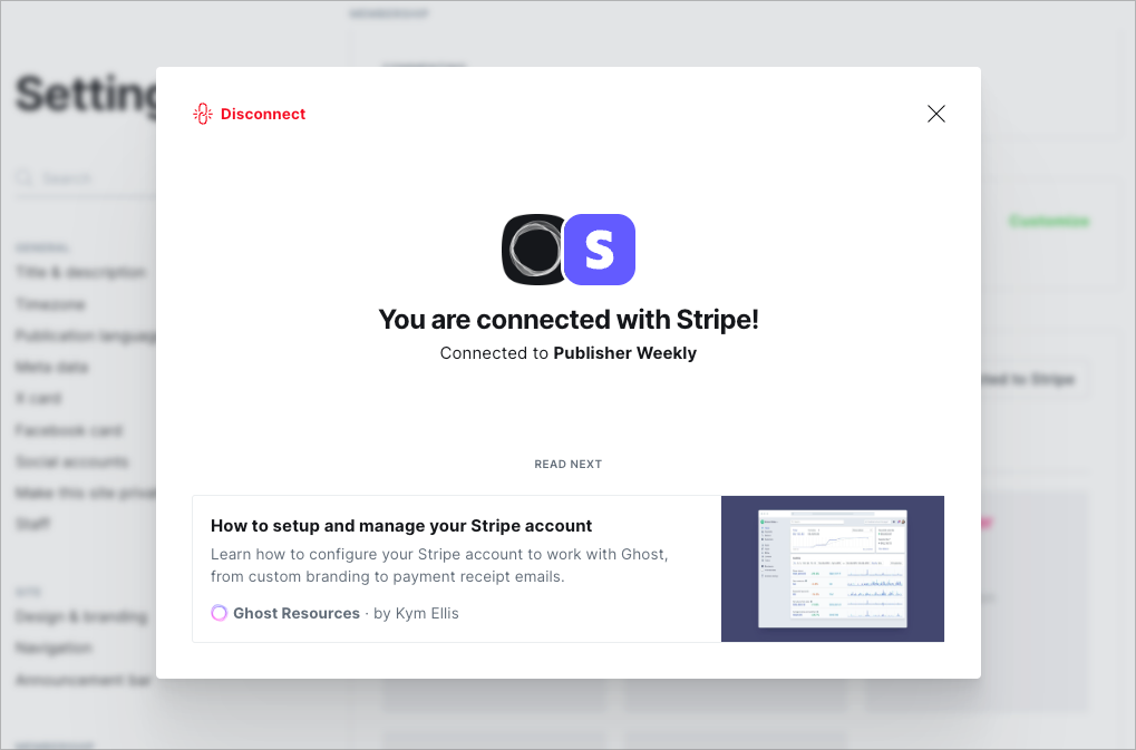 You're now connected to Stripe and able to take payments on your Ghost site.