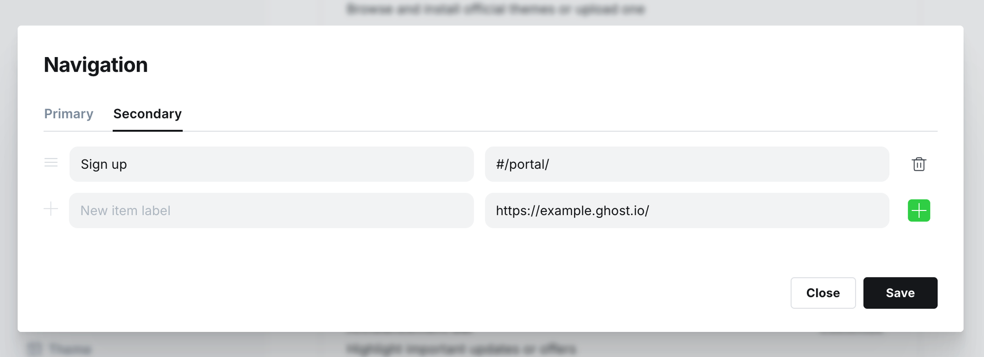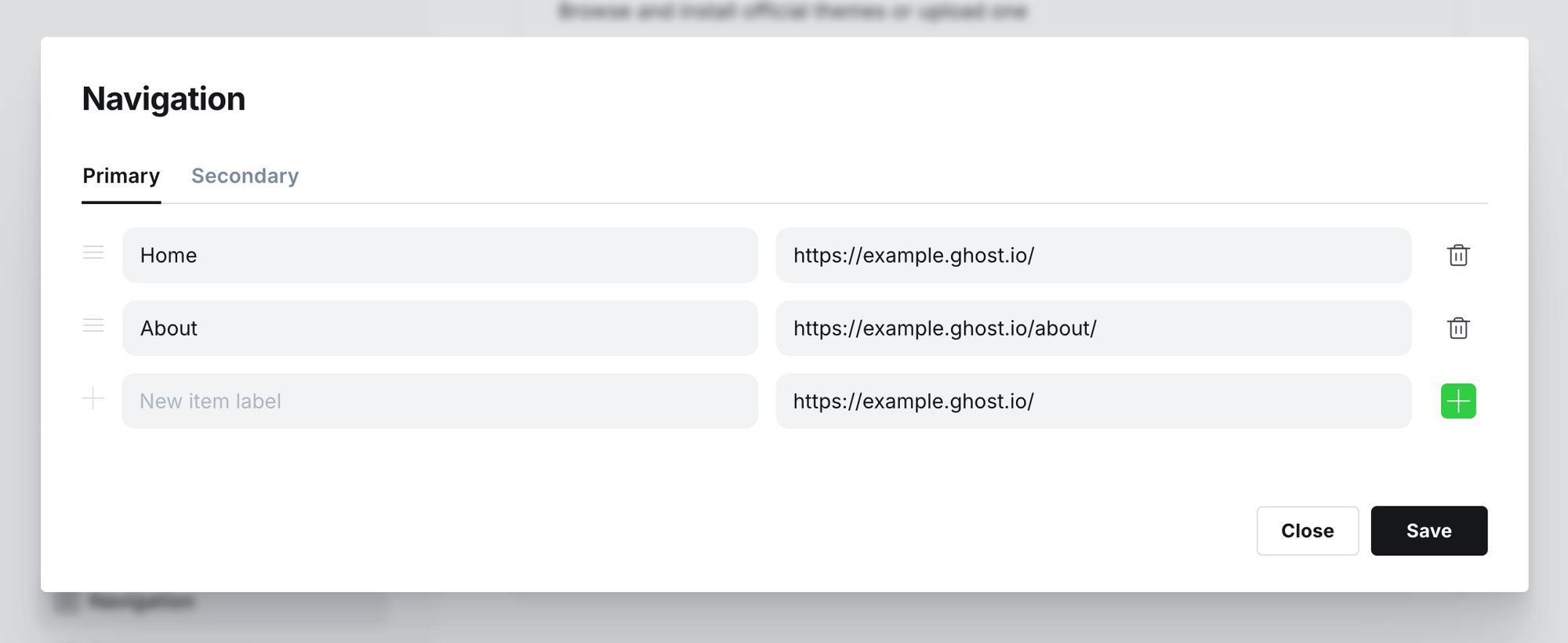 Your site's navigation menu can be updated directly in Ghost Admin from the Settings → Site → Navigation section. By clicking on Customize, a new menu will pop up which allows you to add or edit items in your primary & secondary navigation.