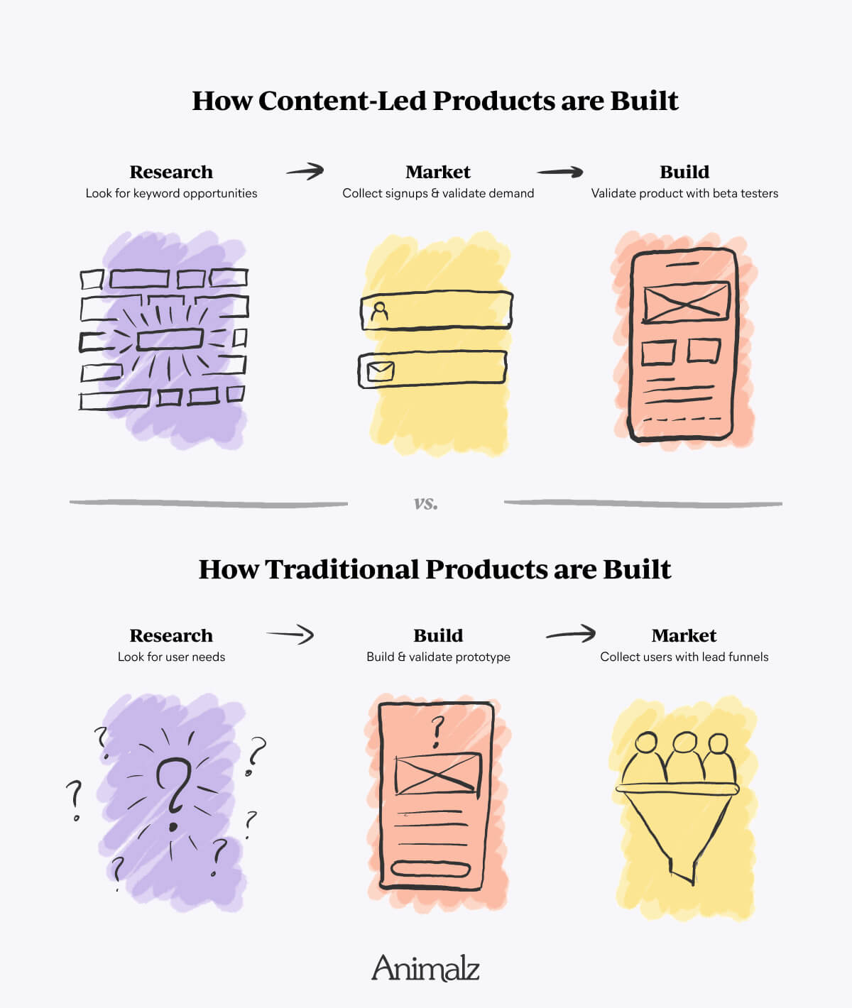 - Building and finalizing a product can take months, but generating content can only take weeks or even a few days. This saves you time and money. Starting with content first also gives Google time to index and helps you discover if there's a market for your new product/feature.