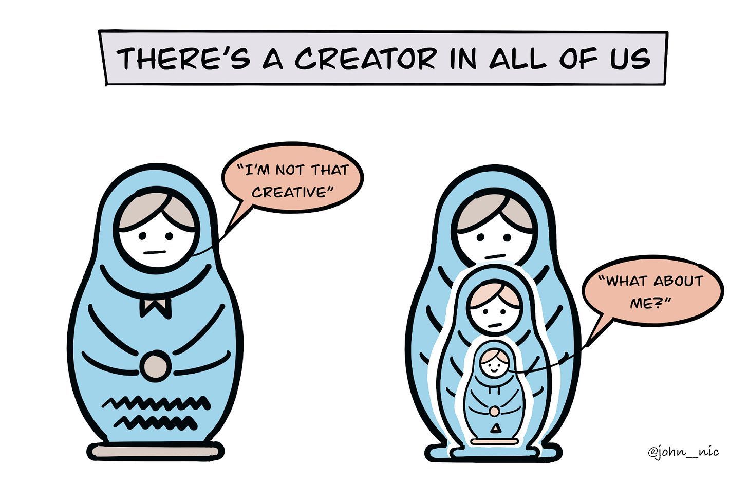 If you need to hear this - you are creative. You have permission to create. In fact, you should. Sure, maybe we won't become virtuosos like Picasso or Tolstoy, but the admiration for other artists points to a creative force inside of us waiting to be unleashed. Everyone has a story to share. We just need to permit ourselves to take the leap. – John Nicholas
