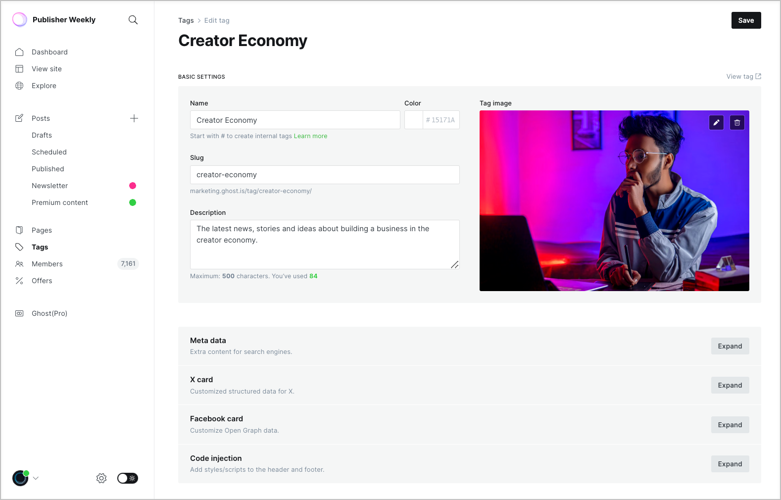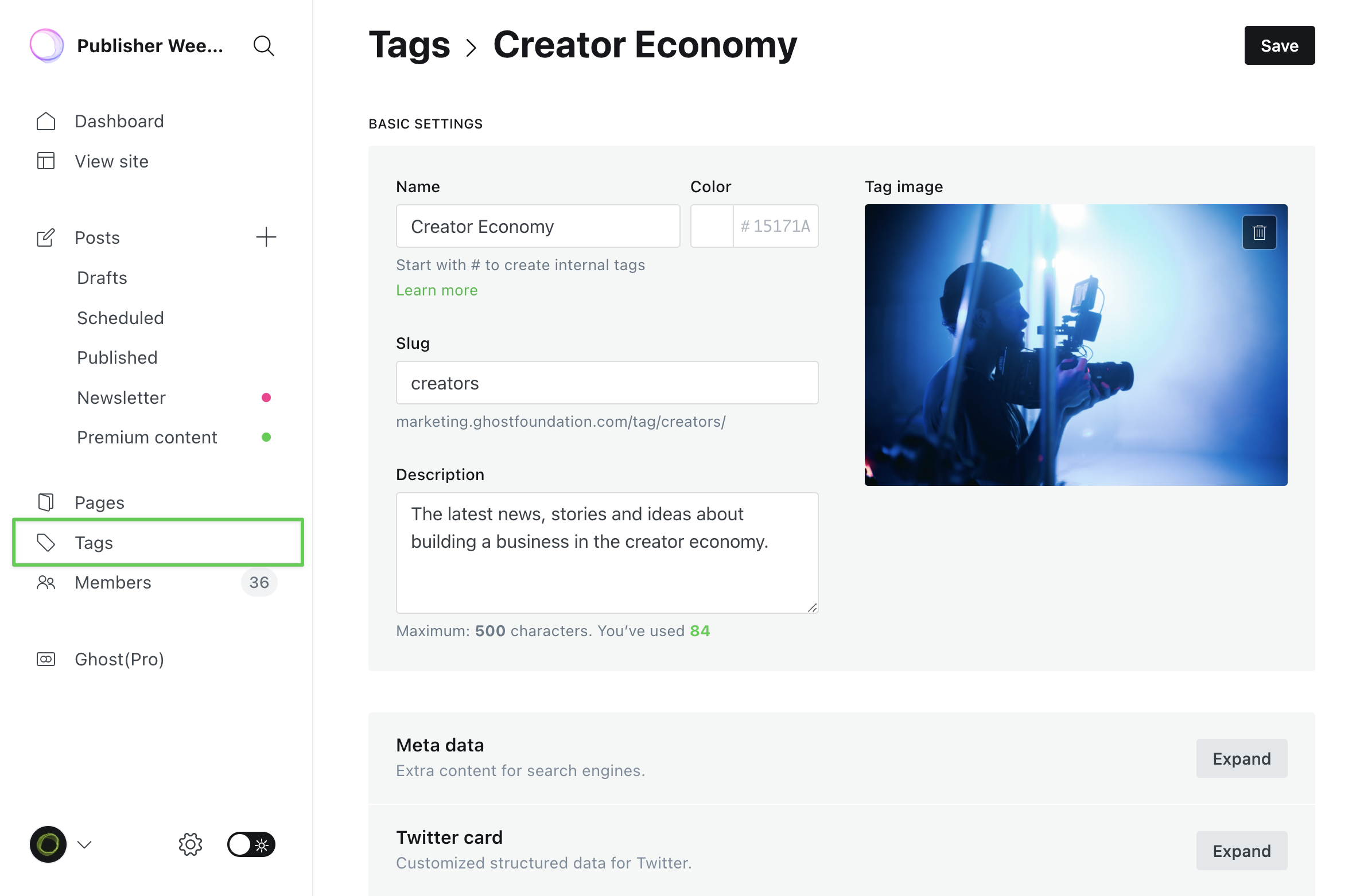 Tags in Ghost are a powerful tool for content organization, that allow you to quickly organize content by topic, or by type (e.g. articles, podcast episodes and newsletter issues).