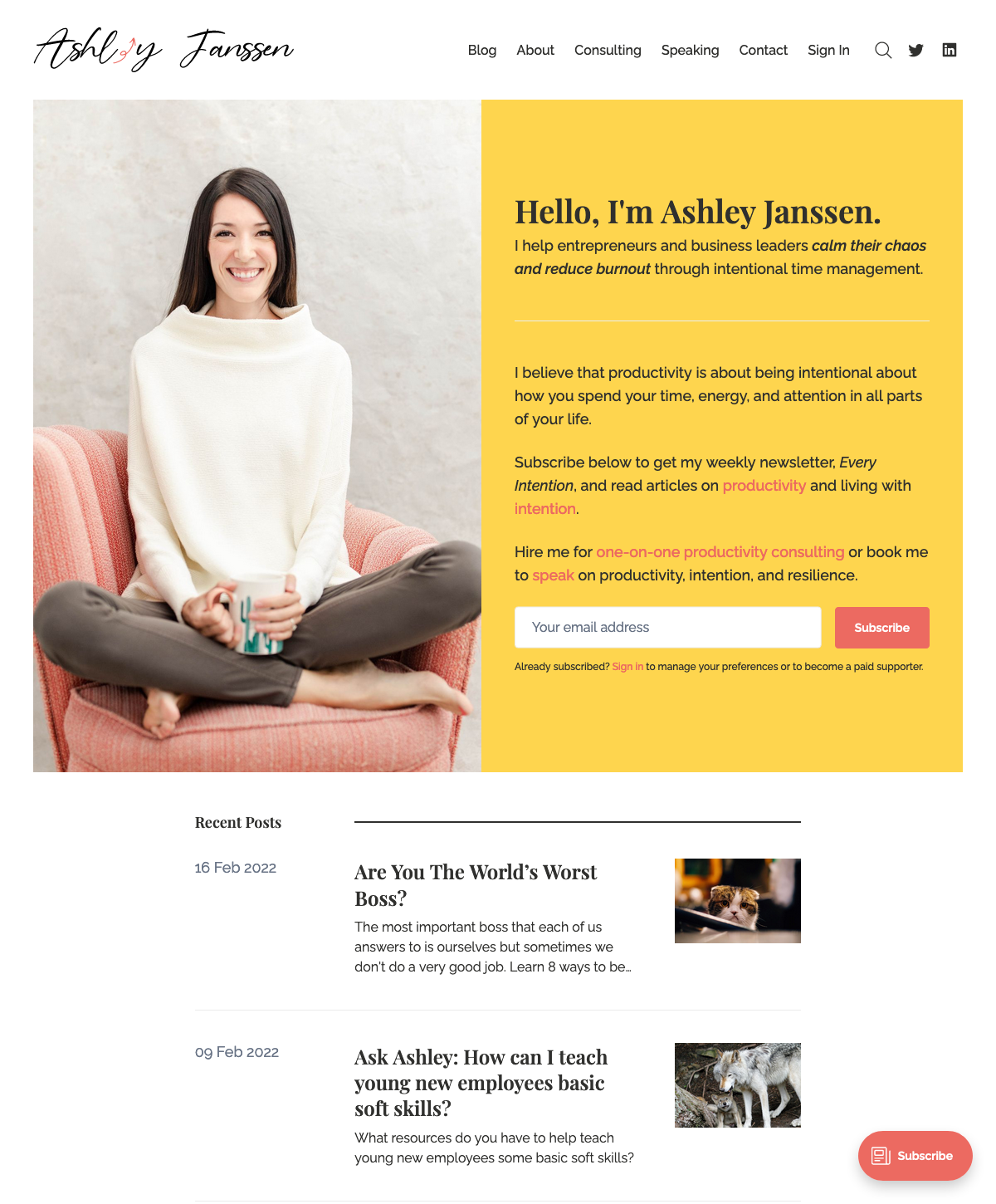 For example, Ashley Janssen has used this structure to share information about what their content helps people do (helps business leaders calm their chaos), with a subscription form, followed by their latest posts.