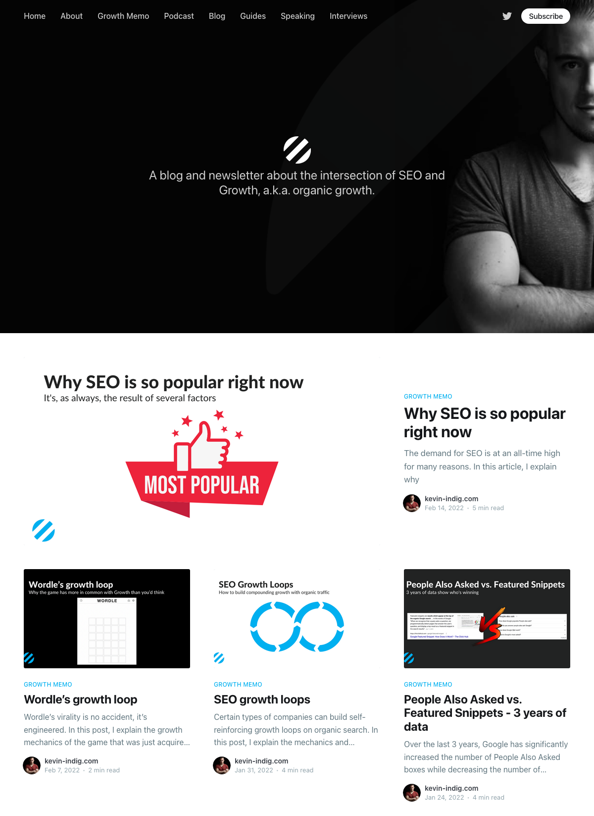 A great example of this type of home page in action is Kevin Indig’s SEO blog and newsletter: