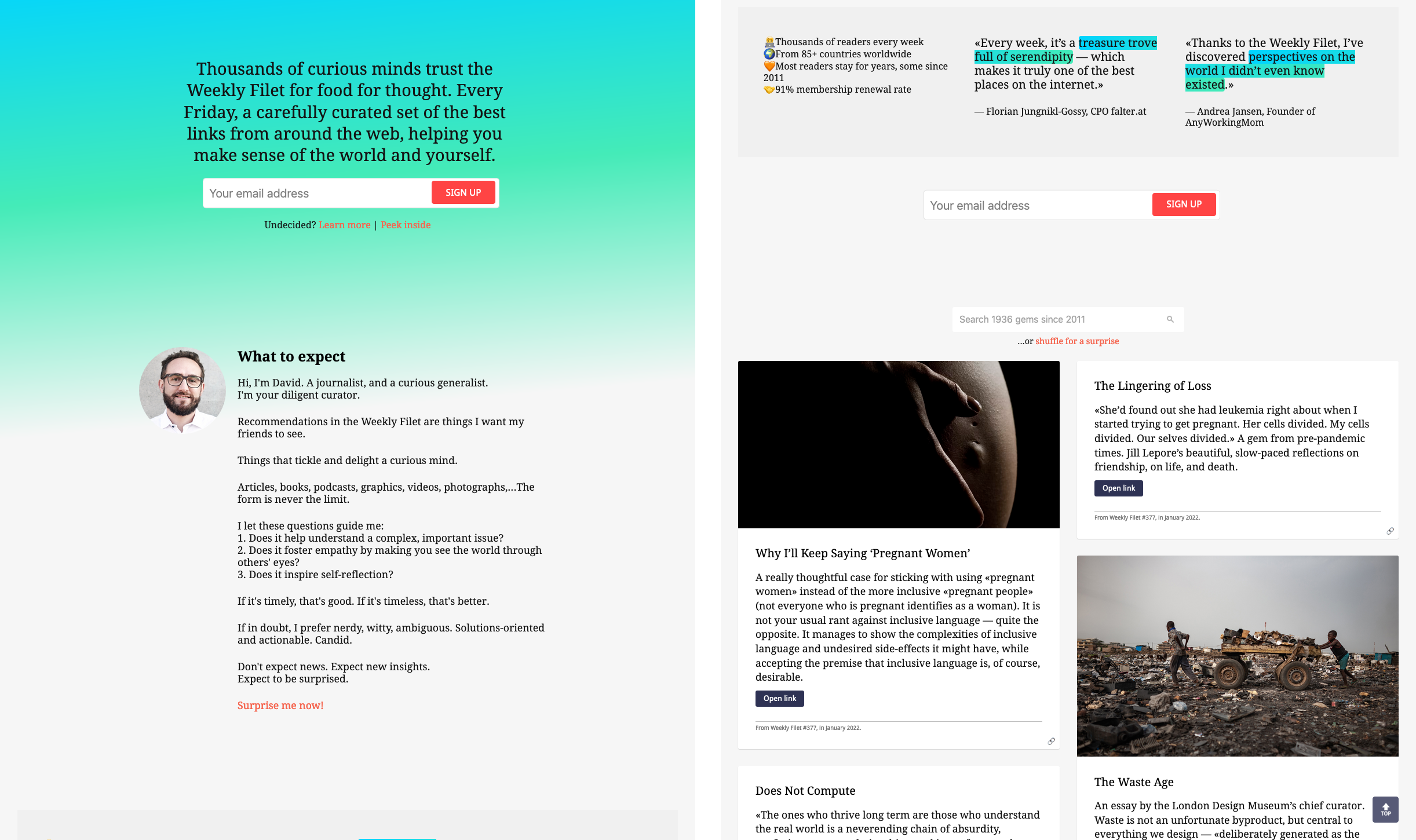 This paid curated newsletter uses a subscription focused custom home page, with testimonials and a small selection of free previews: