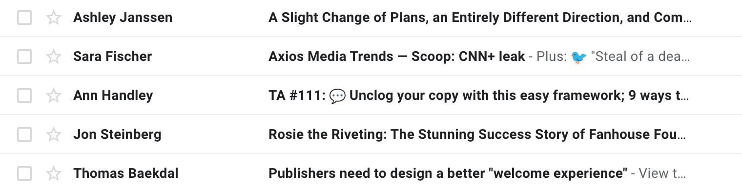 The second step is "Is this brand/person someone I recognize?". Your sender name needs to immediately align with what they subscribed for. This is especially important for new subscribers who have recently discovered your work and entered their email address on your website. When that first email comes in, they need to quickly associate your sender name with what they were signing up for.