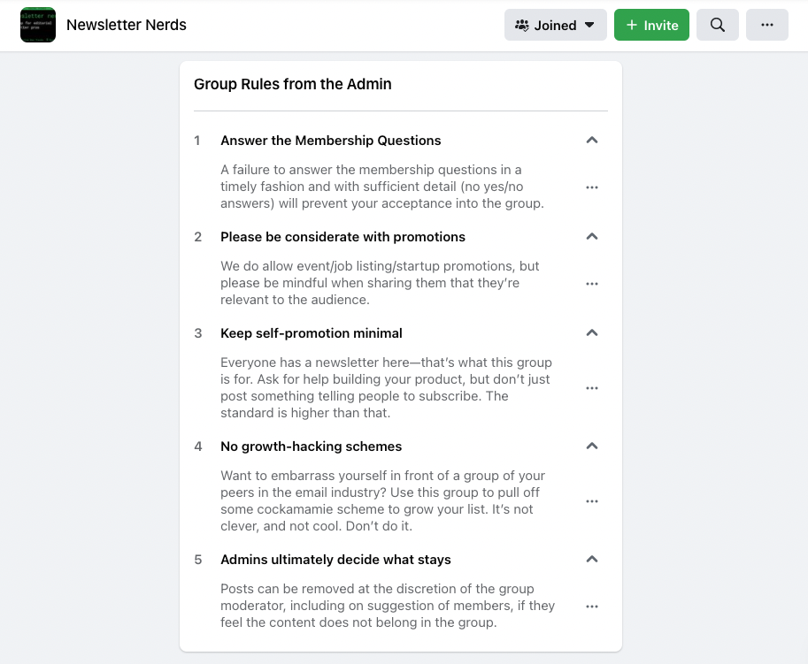 These items will help you create the rules members must abide by. Here’s an example from a Facebook group for email newsletter publishers.