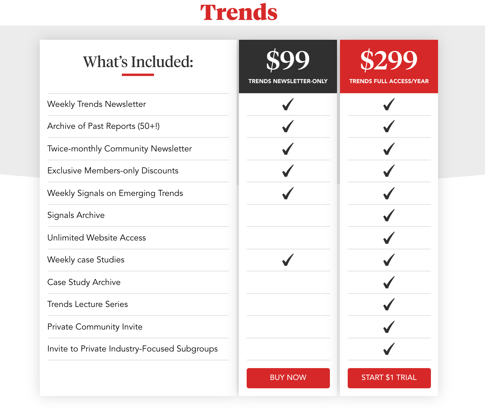 - Trends by The Hustle is a premium newsletter that offers community to their top-tier subscribers.