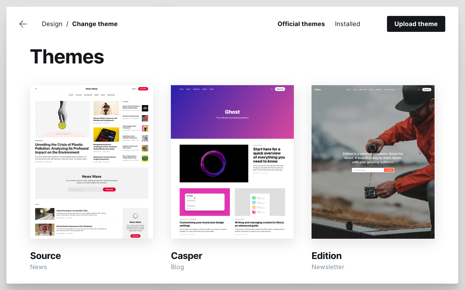 By default, new sites are created with Ghost's friendly publication theme, Source. Everything in Source is optimized to work for the most common types of blogs, newsletters, and publications that people create with Ghost — so it's a perfect place to start.