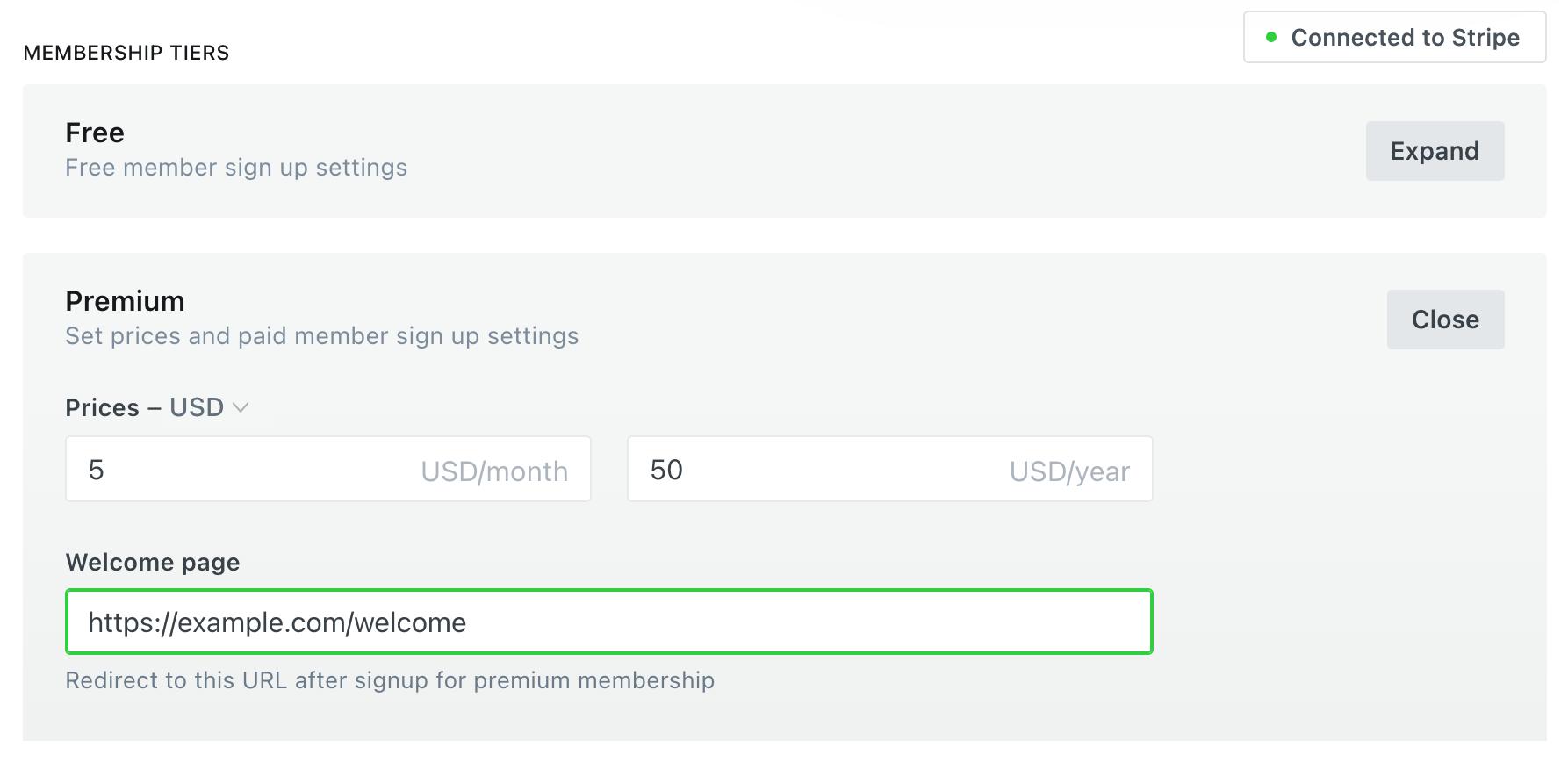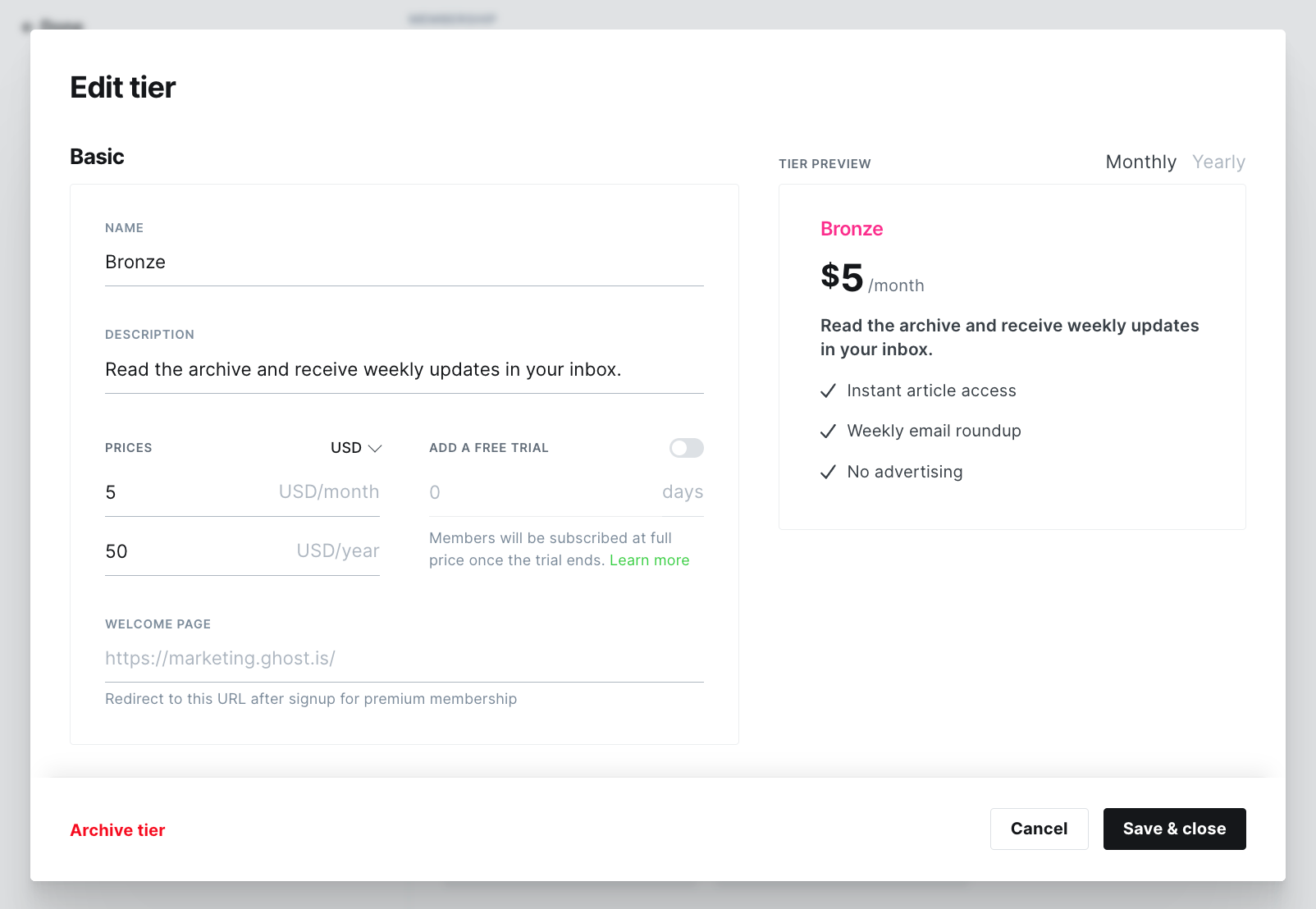 Once Stripe is connected, you can create premium subscription prices directly inside Ghost Admin — these products and prices will be automatically added to your Stripe account.