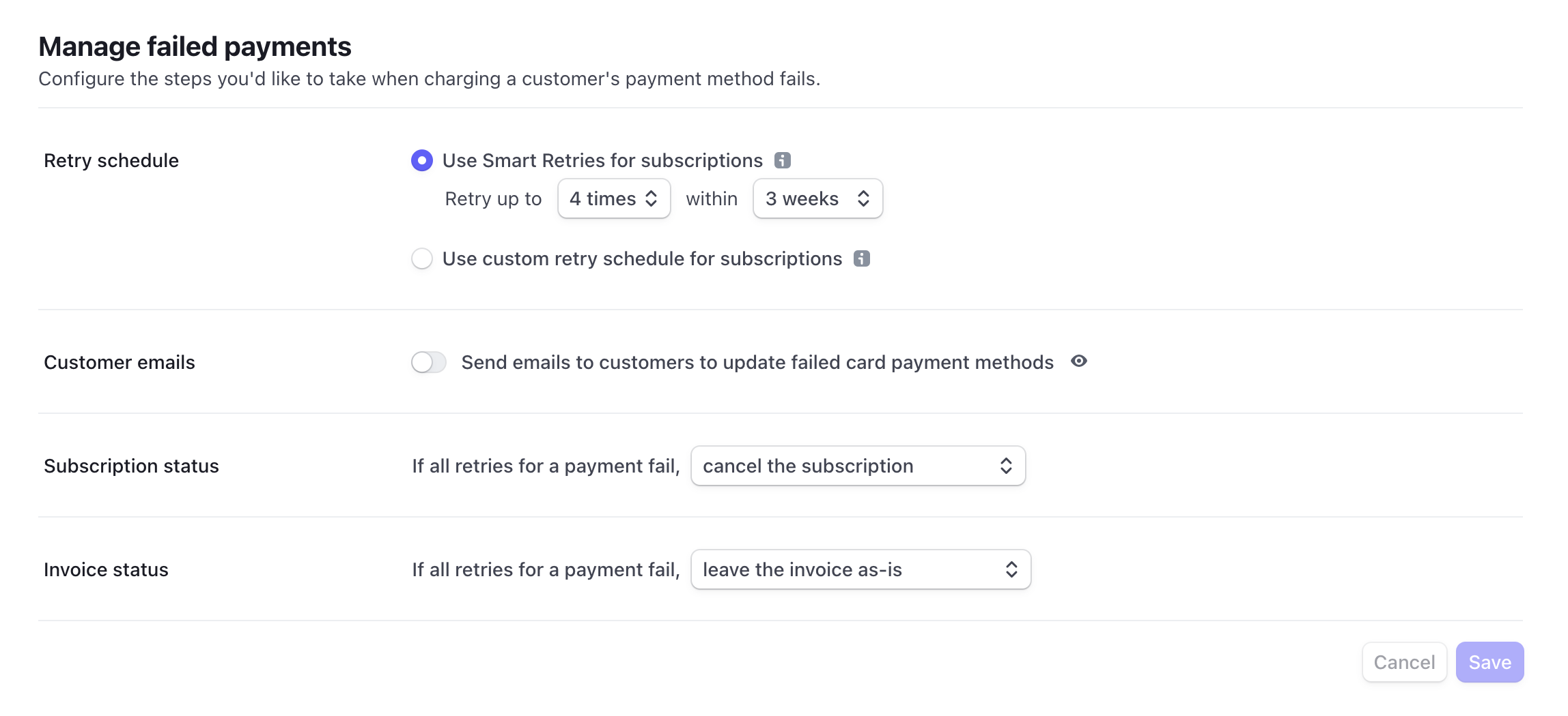 - Stripe has native features that define parameters for how you’d like to manage failed payments, like Smart Retries and automated emails for failed card payment methods, which you can find in the Billing section.