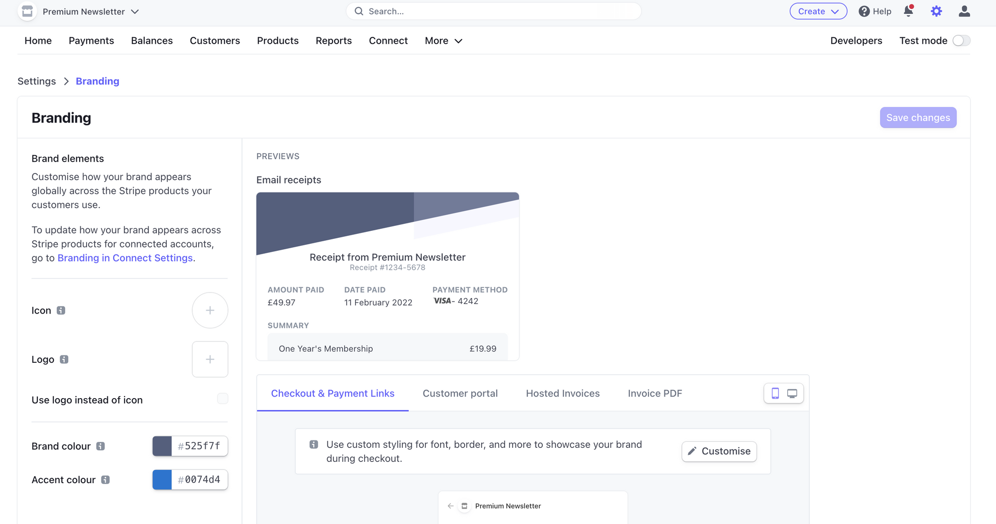 This allows you to add an icon, logo, and accent colors to give your Stripe checkout page more personality.
