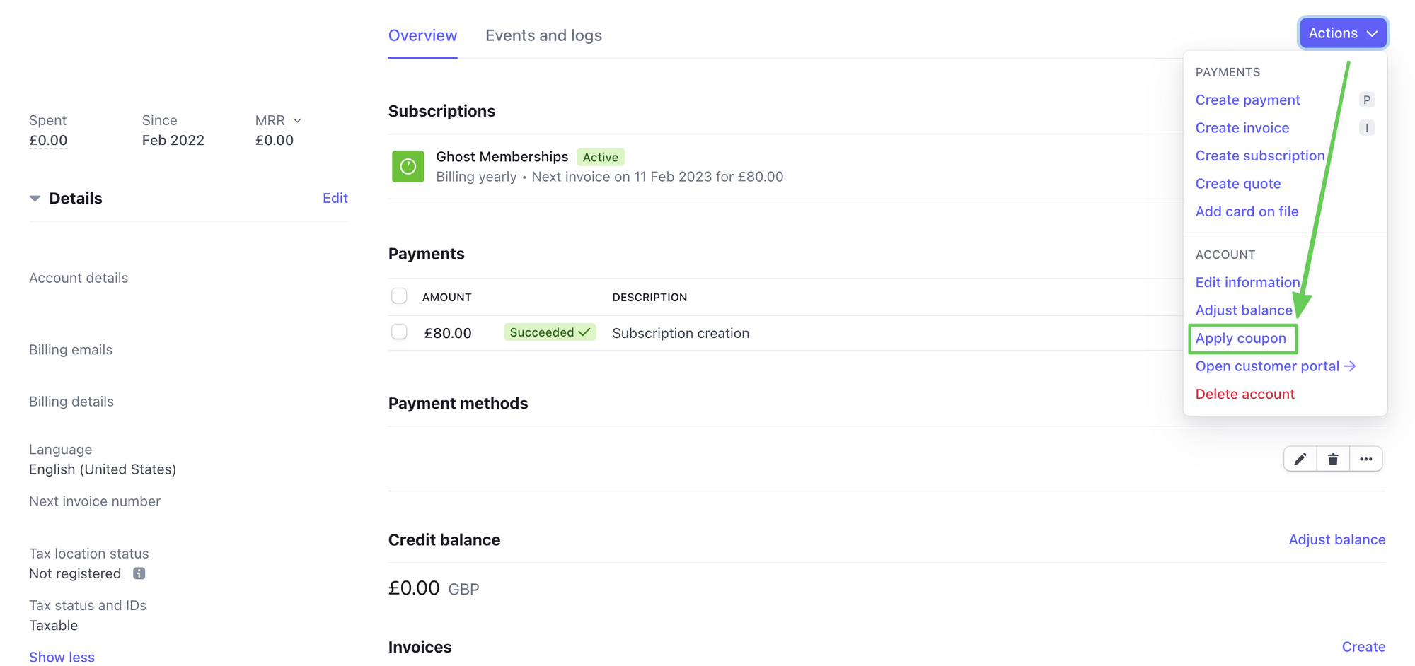 Next, find the customer to whom you’d like to apply a discount by searching for their email address. Open up their customer information in the dashboard and navigate to Apply coupon from the Actions menu:
