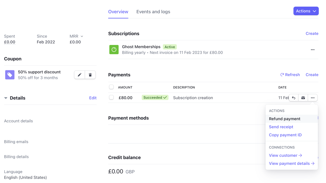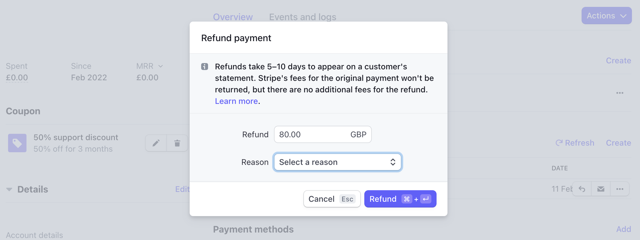Handling refunds in Stripe is a crucial admin task for support scenarios. To process a refund, locate the customer's profile from the Stripe dashboard. Under the Payments section, click the three dots to open the actions menu and select Refund payment.