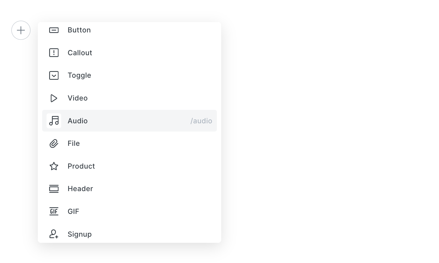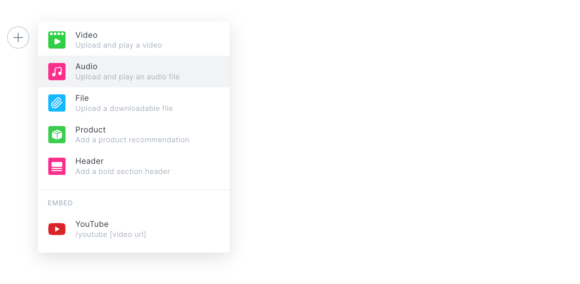 If you need to embed larger files or are already using another tool to upload episodes, don't worry. You can embed dynamic content from almost any service, including audio players for podcast episodes. Ghost offers dedicated audio integrations that you can use to embed podcasts, like Soundcloud, Spotify, and YouTube.