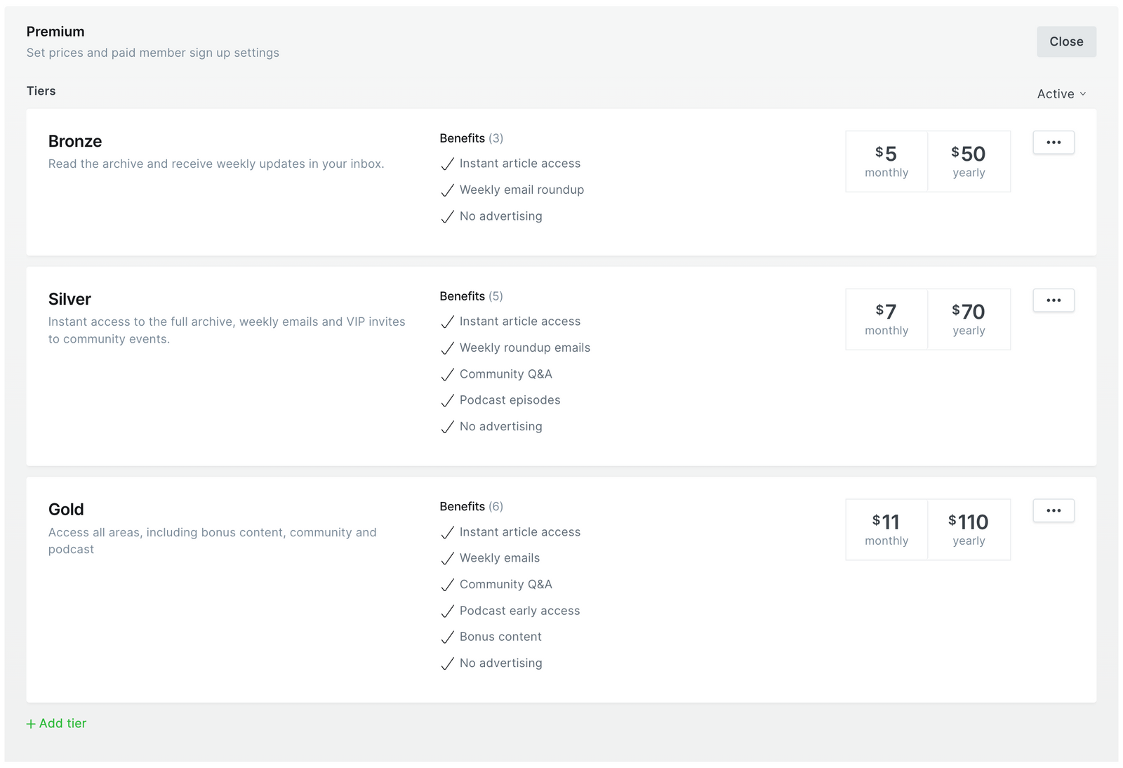 If you'd like to generate podcast revenue, you can use membership tiers to invite your audience to subscribe for access to premium content and extra perks. Premium tiers and their benefits are entirely flexible, so you can decide whether to offer early access to podcast episodes or extended versions of your podcast for paid members only.