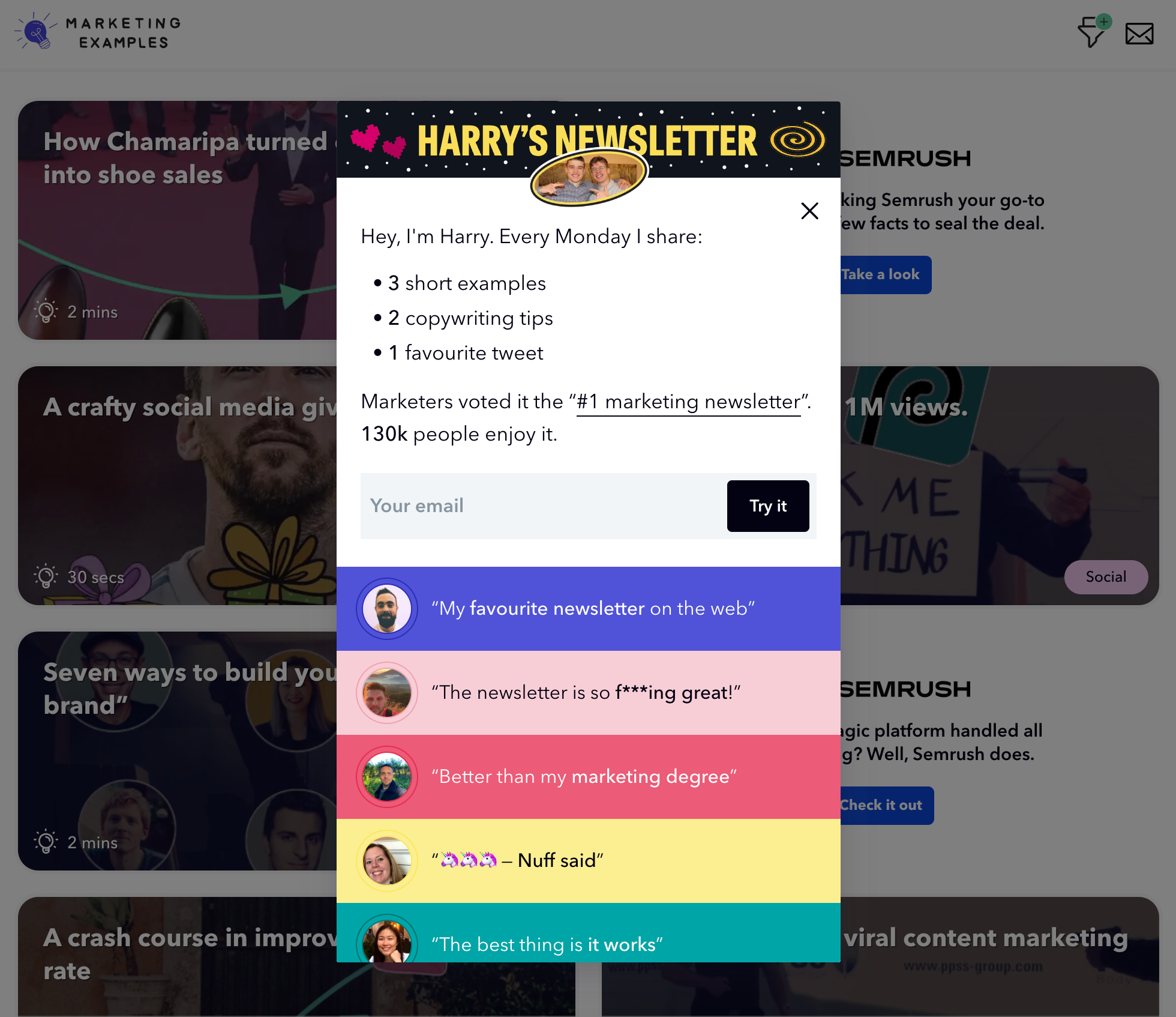 Harry Dry shares incredibly concise and powerful marketing tips on the Marketing Examples website and newsletter, including this stealable formula for crafting marketing copy: