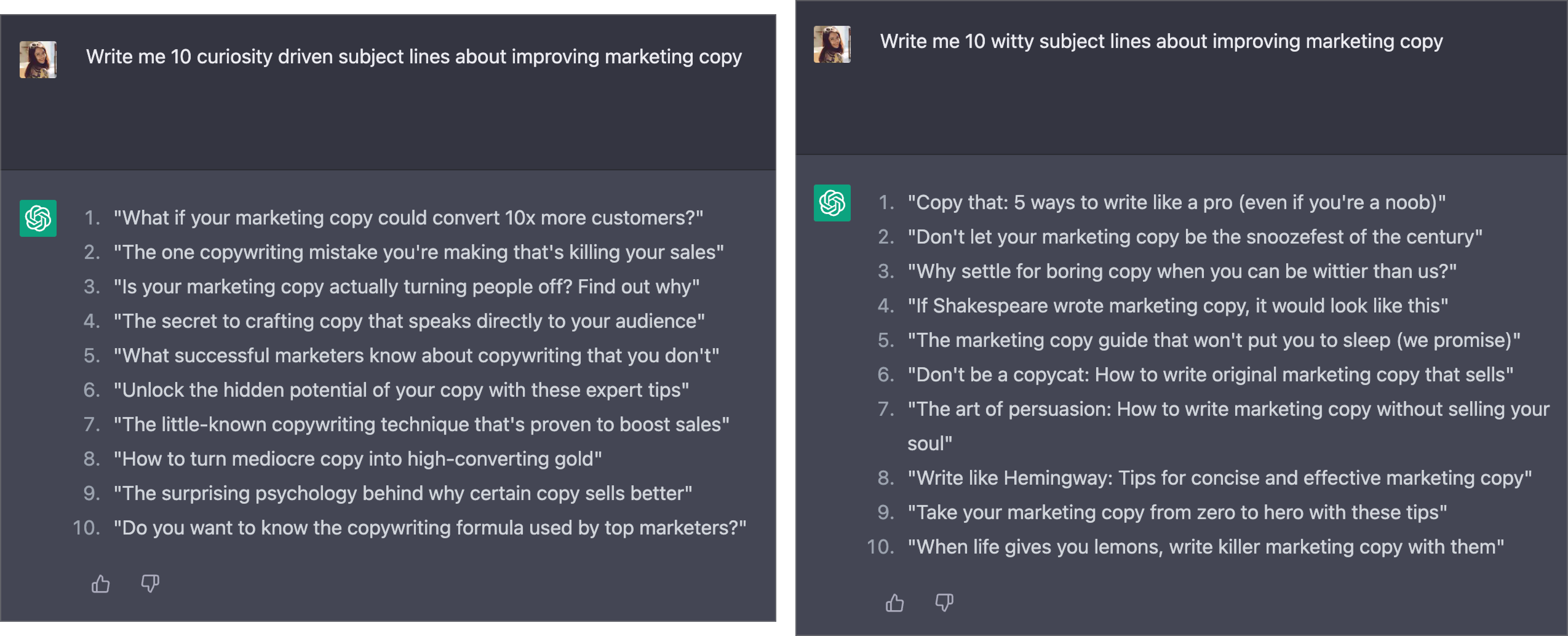 A simple prompt to try is: Give me 10 email subject lines about [topic]. The results are usually a good start, but they can be quite generic. For example, here are some outputs for the prompt Give me 10 email subject lines about improving marketing copy: