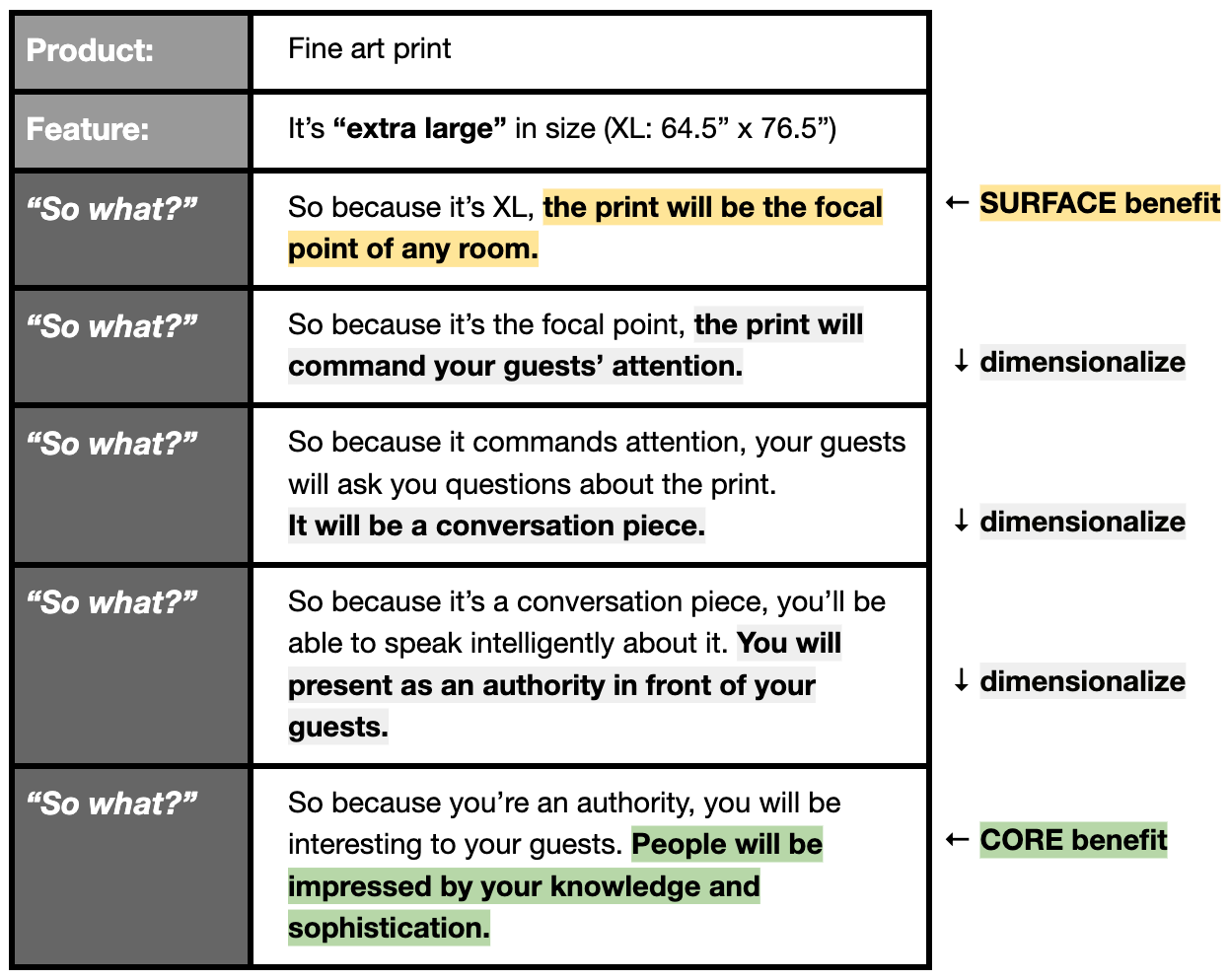 In the example above, the size of the fine art print is a superficial benefit, compared to the final core benefit, which is psychological β offering self-esteem, social approval, and respect.