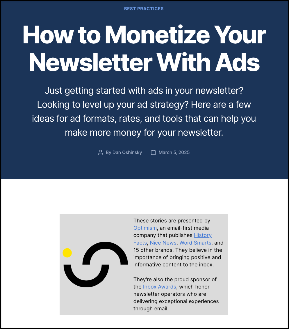 There are lots of ways to monetize your newsletter, and selling ads works for many publications. If you've tried numerous money-making methods and haven't found one that's clicked, you may discover the perfect partnership in newsletter sponsors. This week's newsletter is about how to get started with placing ads in your newsletter, authoring an airtight advertising pitch, and setting the right price for your sponsorships. Let's go!