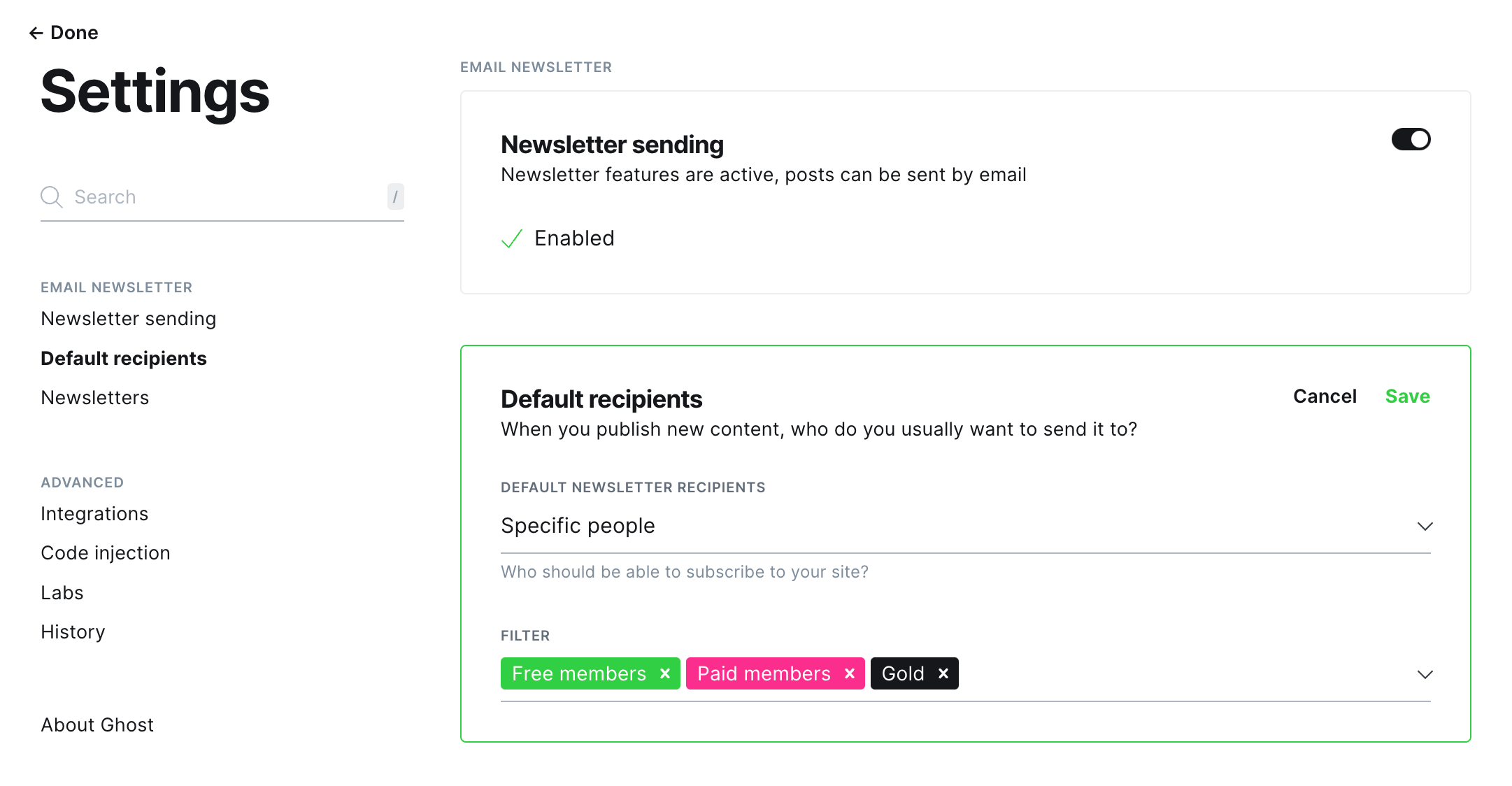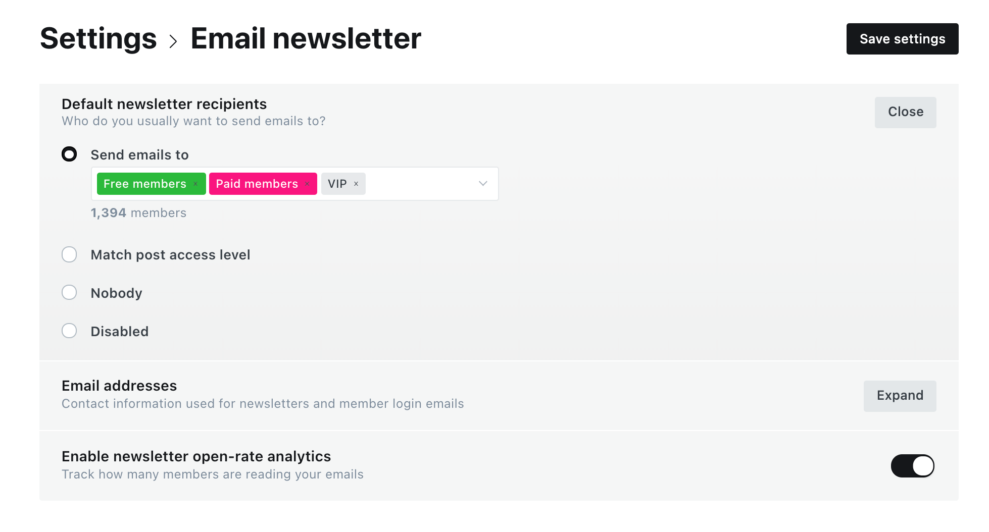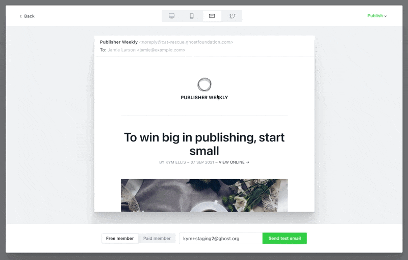 You can send yourself a test newsletter to ensure everything looks nice in your email client. Then, click Publish to decide who to deliver it to based on member status or specific groups of people.