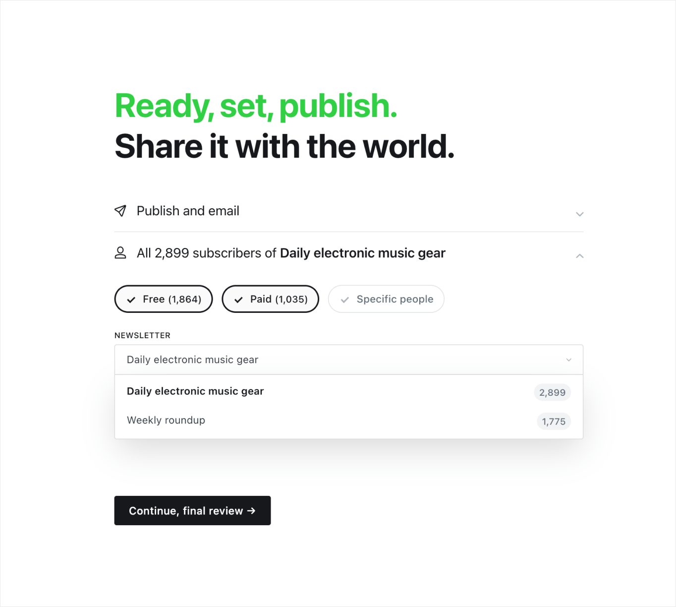 You're ready to send your first newsletter! Inside your post, click Preview to see what your content looks like on Web, Mobile, Email, and Social before publishing.