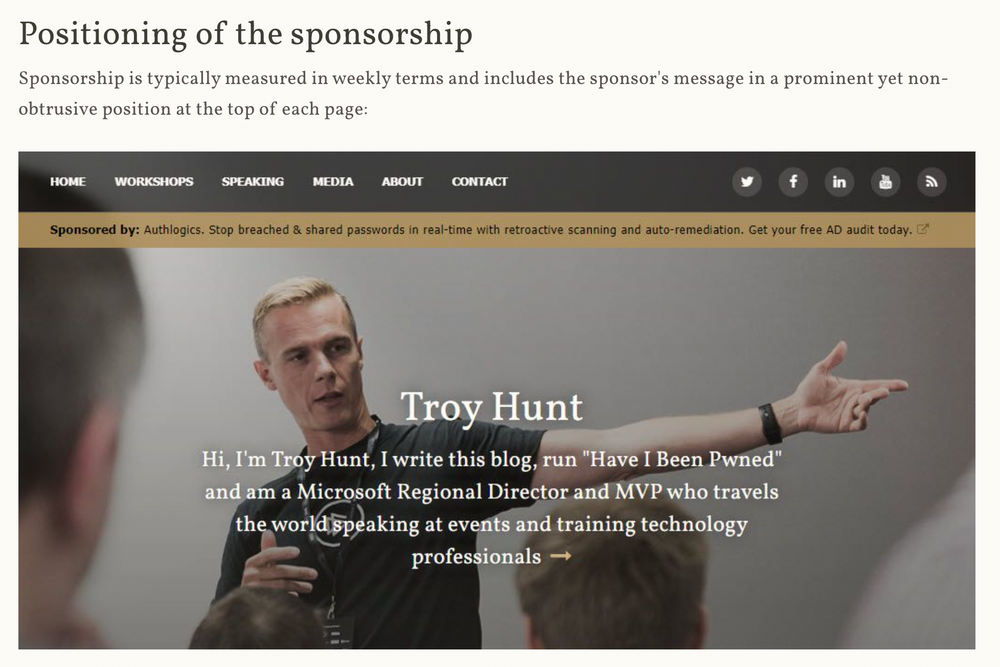 - Make potential sponsors feel confident by including numerous figures, examples of past sponsors, and details on placement. Check out Troy Hunt's sponsorship page for a great example of this.