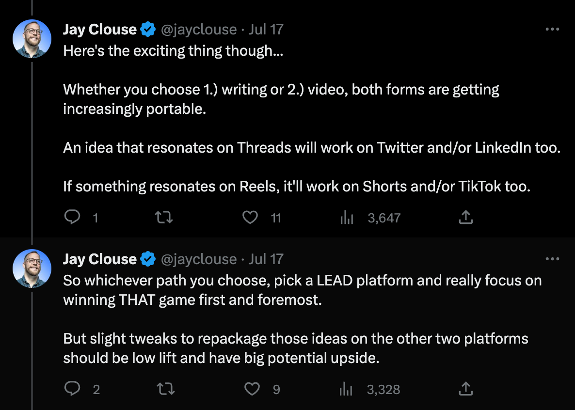 Gaining followers on Instagram is a 2-for-1 with Threads (sort of), and YouTube shorts can be a foot in the door for regular, long-form YouTube, whereas TikTok feels more risky, Jay explains.