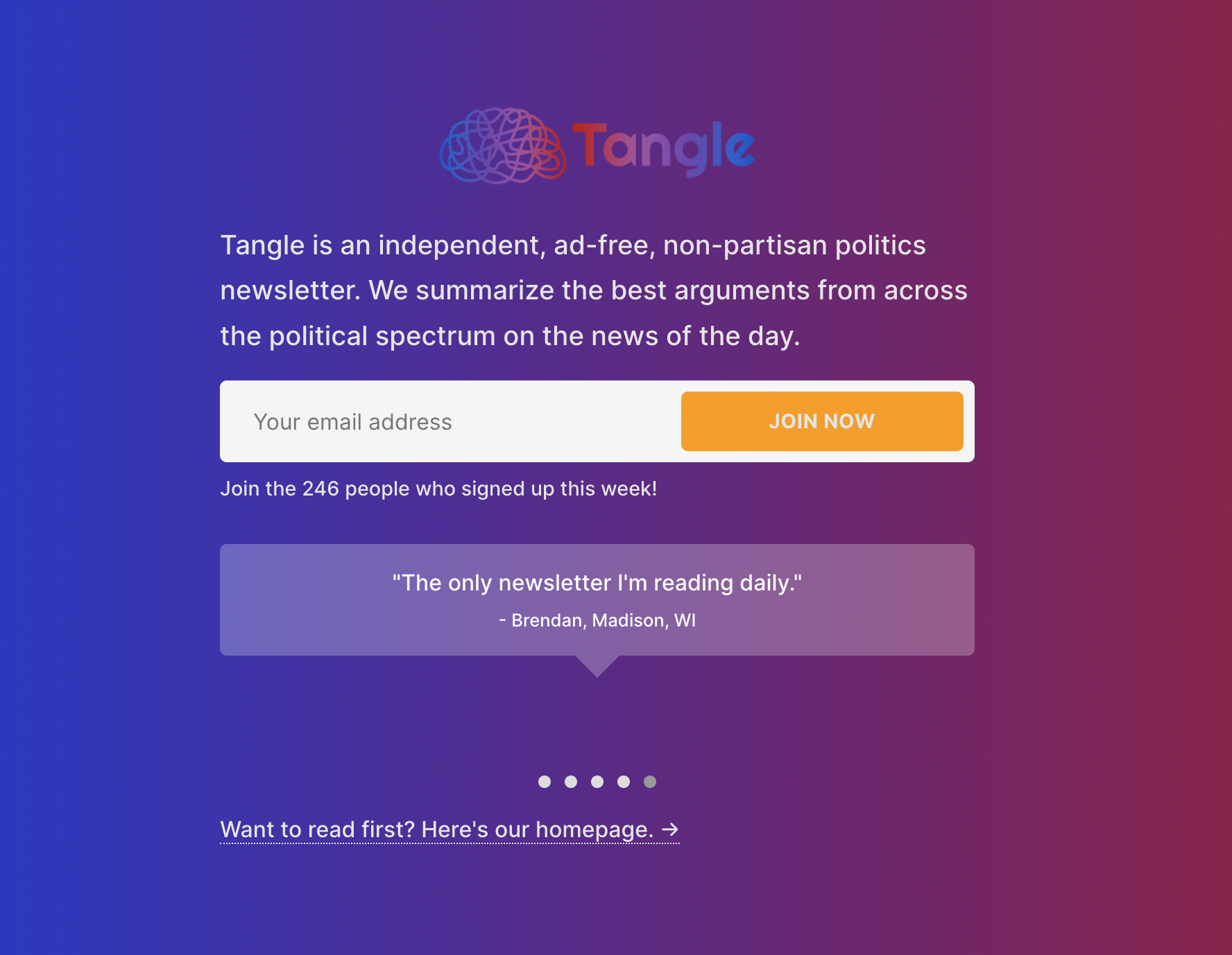 Our target audience is people who are interested in politics but know that they aren’t getting the full story. It doesn’t matter whether you are a political junkie or someone who just wants to grow their understanding now, Tangle is a great place for you. Monday through Thursday, we publish a free newsletter that summarizes the best arguments from the right, left and center on the news of the day. And then on Fridays, we publish subscribers-only content like interviews, reader-requested content, personal essays and more.