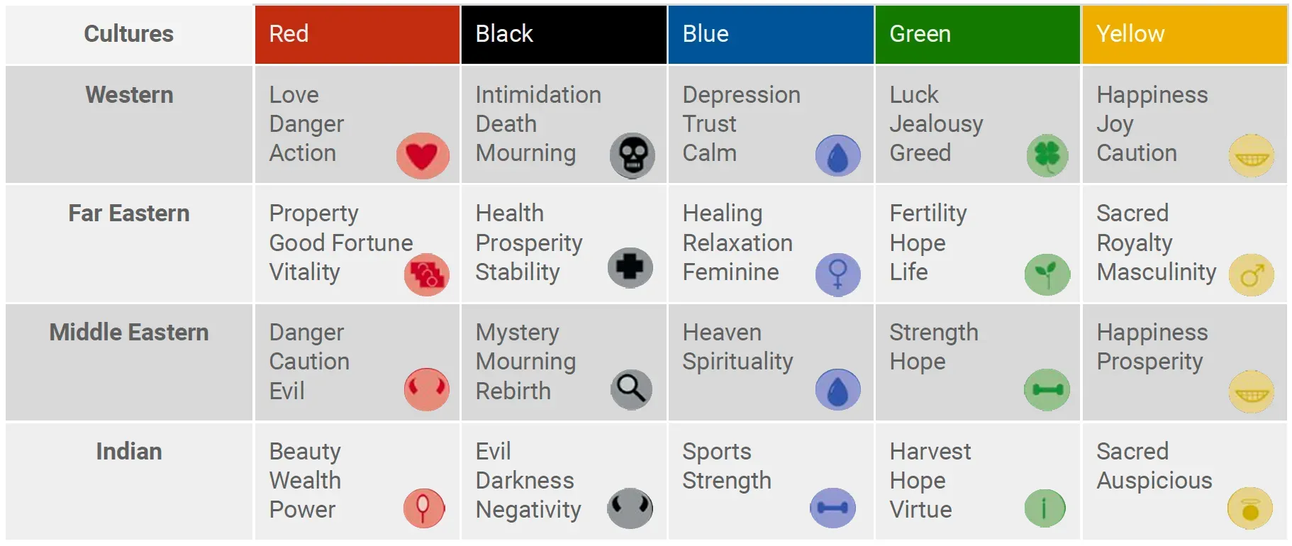 - Color is cultural. Before diving in on your favorite colors based on what they mean to you, consider who your audience is. Check the infographic above to review how the same colors are seen in different parts of the world.