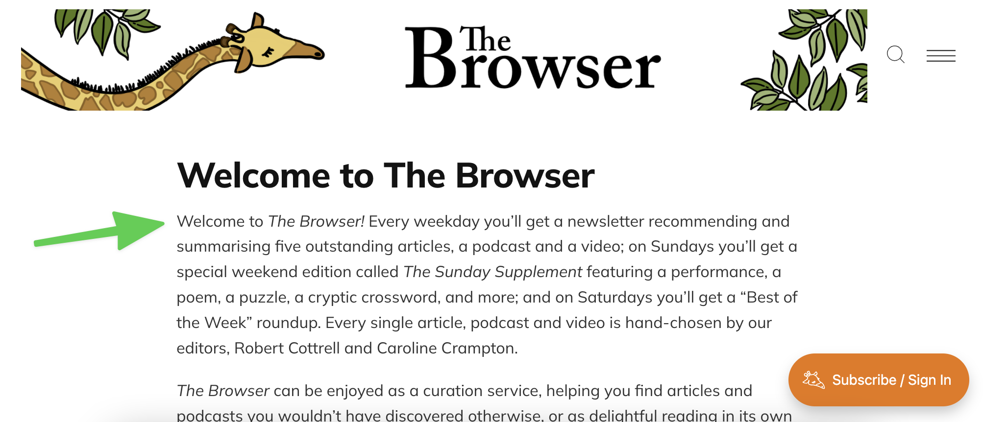 The Browser, a curation-focused newsletter, does an excellent job of this. In the first paragraph on their welcome page, new readers learn that they’ll be receiving a curated list (type) every weekday (frequency) made by their two editors (Robert and Caroline).