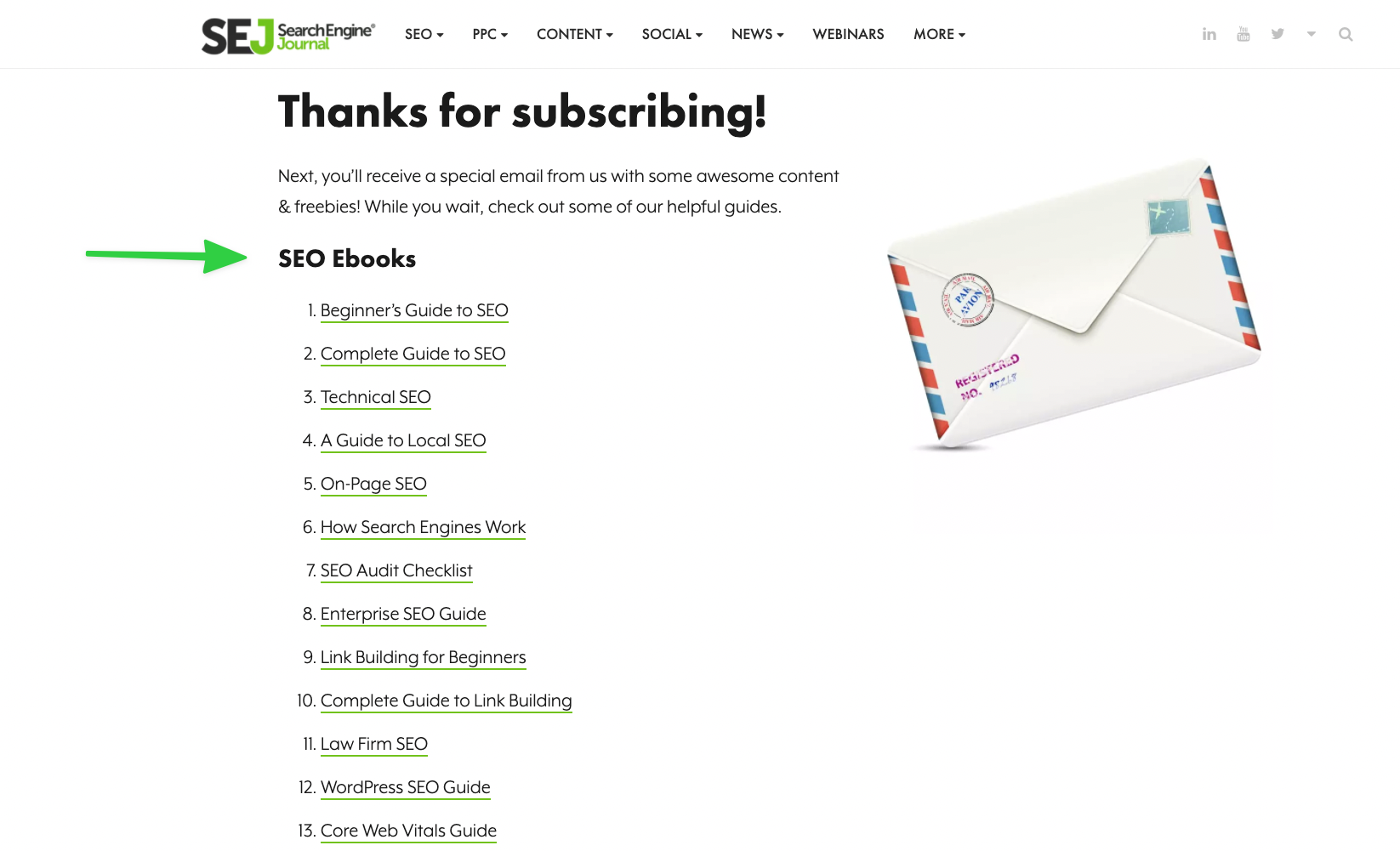 A perfect example of a welcome page with a collection of freebies is this one by Search Engine Journal. Every new subscriber gets access to over two dozen ebooks, which are all conveniently hosted on a single page, making it a resource they're sure to revisit.