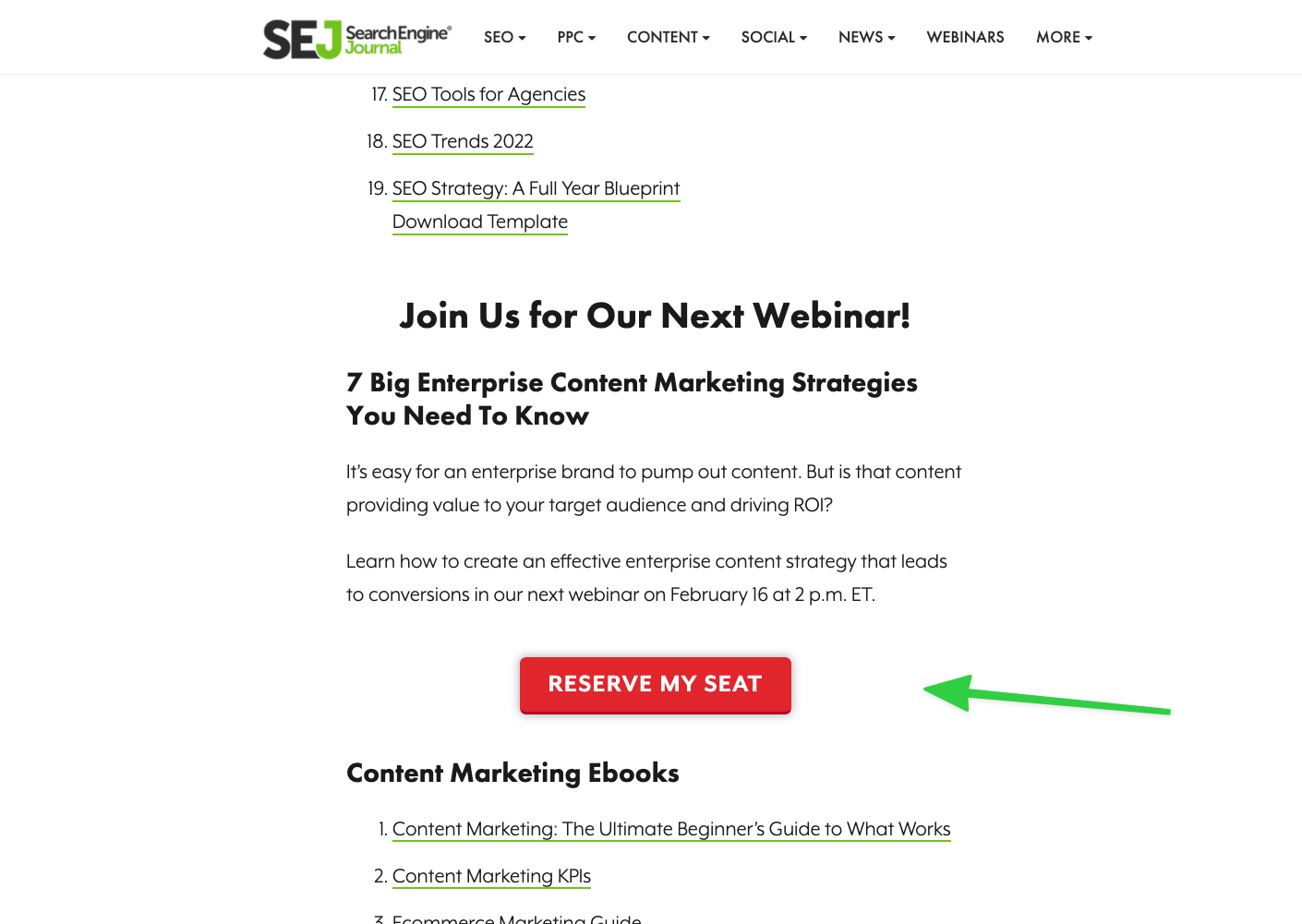 The options are endless, so it’s important to understand what actions will drive your business forward and guide readers towards those. For example, the Search Engine Journal page mentioned above offers new subscribers a seat in an upcoming webinar. The webinar is part of their marketing funnel and helps them turn their audience into revenue.