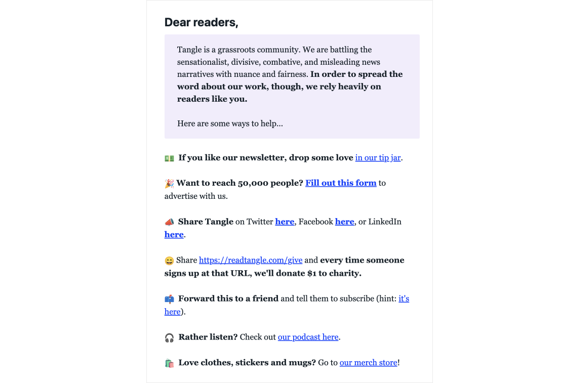 The most common and direct example of encouraging word of mouth is to ask your audience to share your content. Publishers like Stratechery and Tangle do this by simply encouraging their subscribers to forward newsletters to their friends.