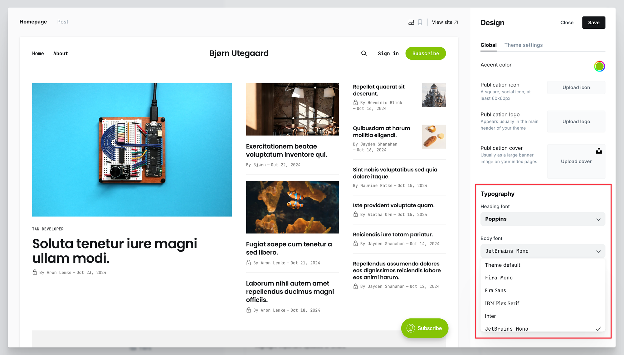 Users can select custom fonts for headings and body content in Design settings. We've carefully curated a set of diverse typefaces that should work well across most themes, aiming for quality over quantity of choices.
