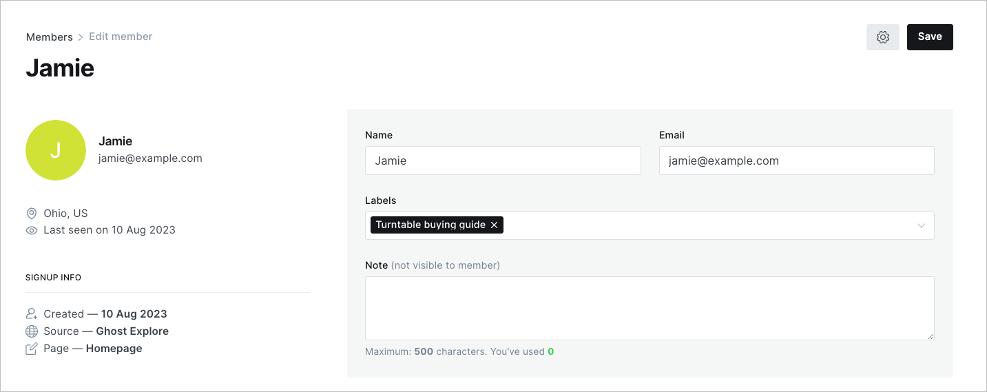Here's what the member profile looks like in Ghost Admin. Note the "Turntable buying guide" label.