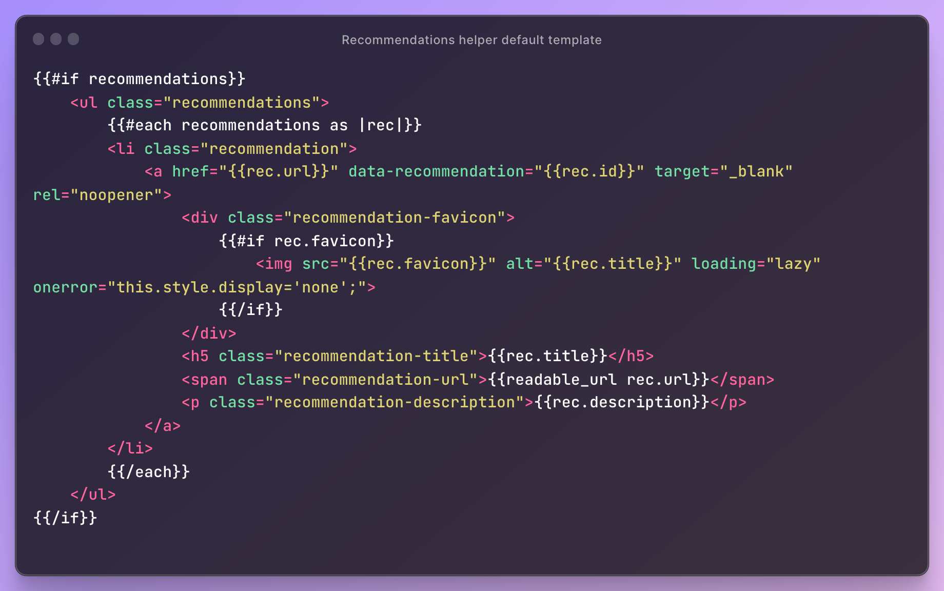 The recommendations helper outputs a list of your recommended sites. Highly customizable, this helper is a great way to share your favorite publications with readers. Below is the default template Ghost uses to output your recommendations (but you can create a totally customized template, too).